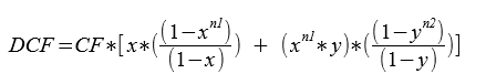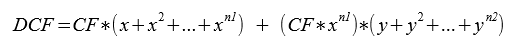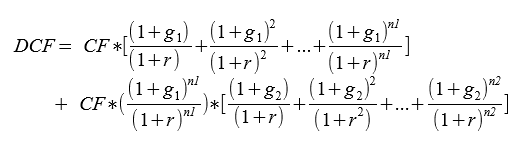 DCF = 50 * [(1,019 * (1-1,019^10) / (1-1,019)) + (1,019^10 * 0,972 * (1-0,972^10) / (1-0,972)) ]